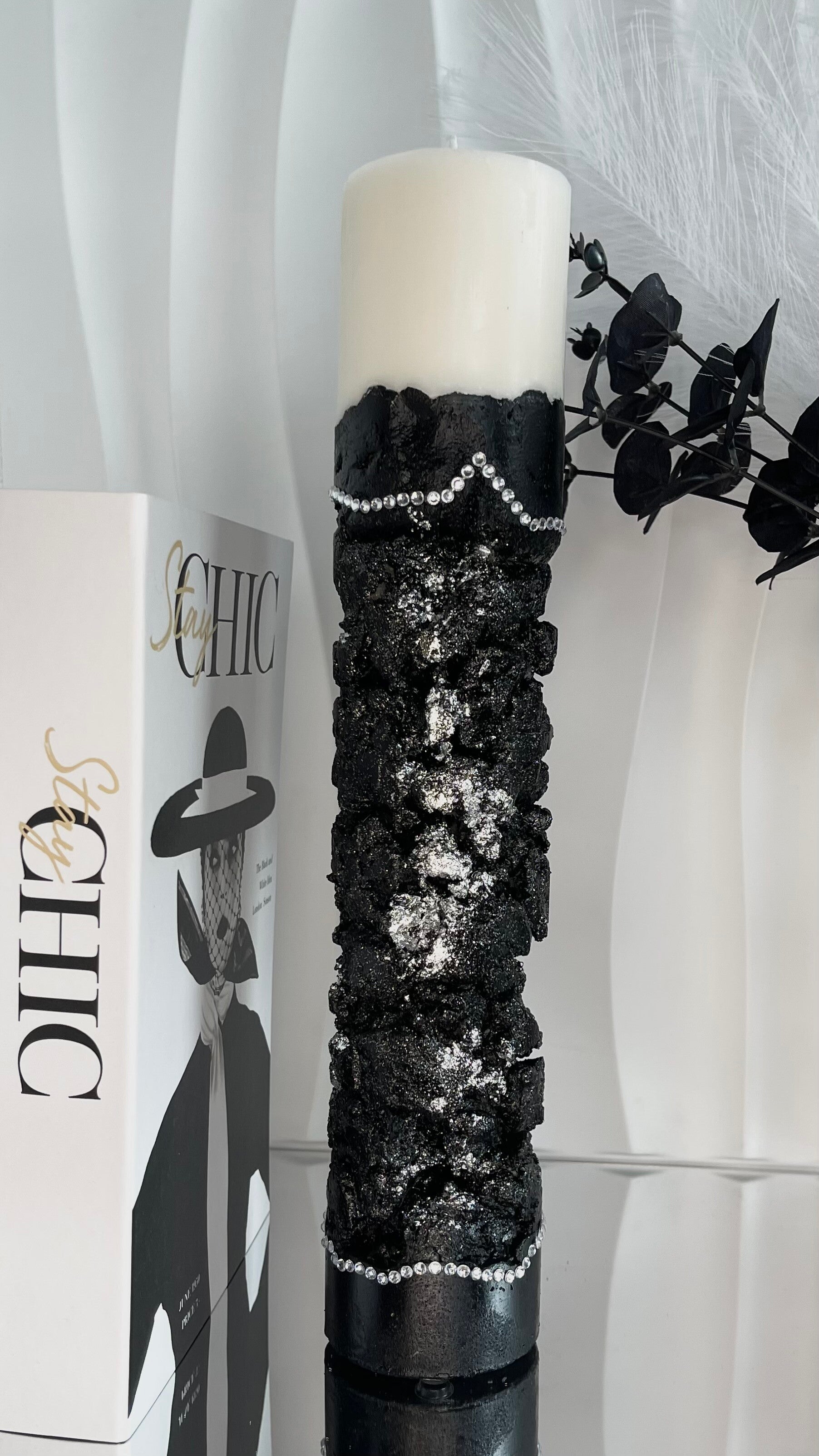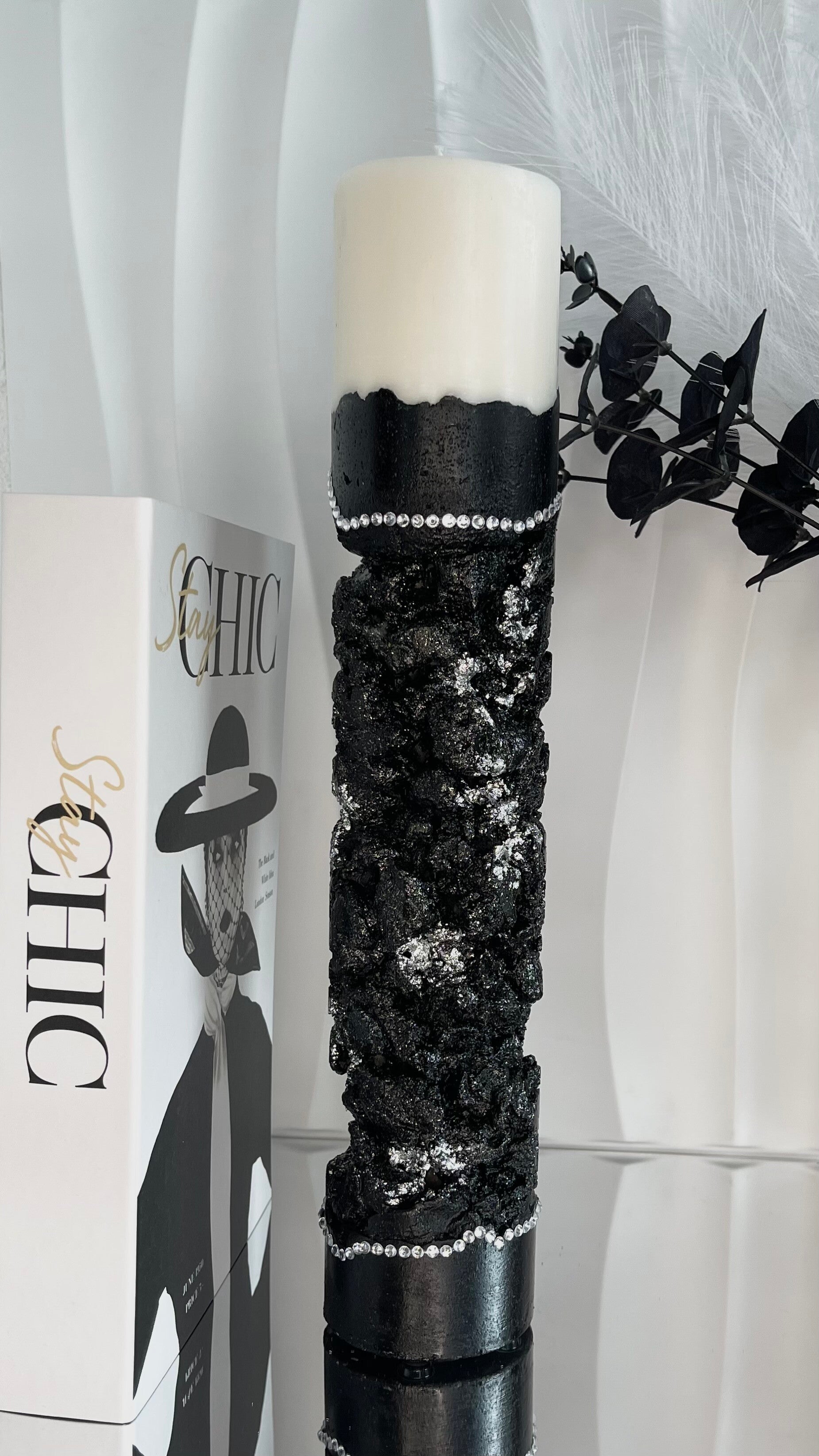 Runde Sojawachskerze auf schwarzem Betonsockel mit Blattsilber