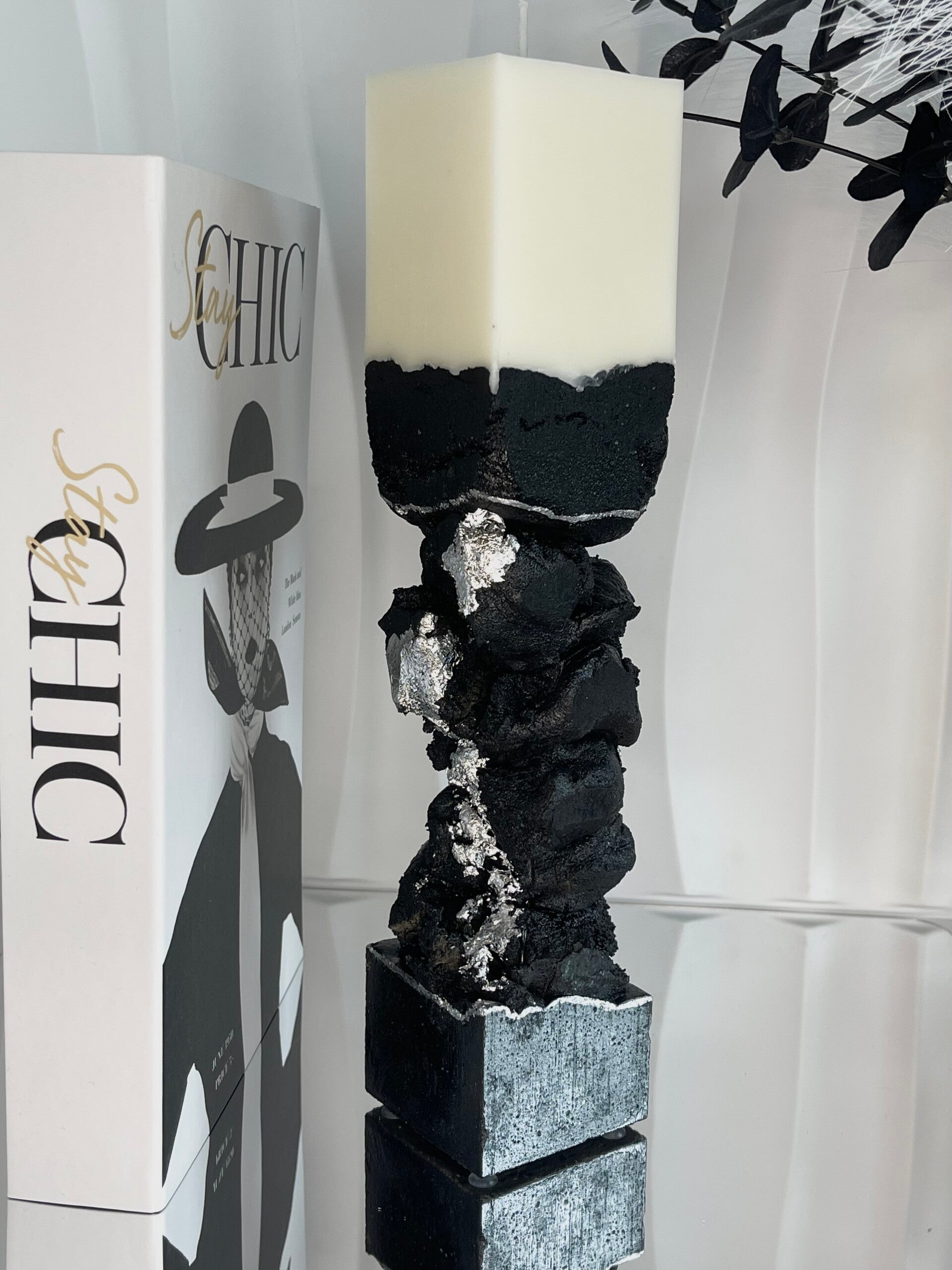 Diese exklusive, handgefertigte Kerze besteht aus 100 % natürlichem Sojawachs und ruht auf einem edlen schwarzen Betonsockel. Die edle Verzierung mit Blattsilber verleiht ihr einen einzigartigen, luxuriösen Look. Perfekt als stilvolle Wohnaccessoire oder als besonderes Geschenk.